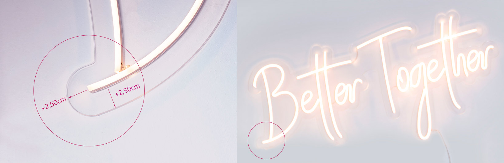 Die im Konfigurator angegebenen Maße beziehen sich auf den LED-Schlauch. Bitte beachten Sie, dass die Acrylglasbasis auf jeder Seite etwa 2,5 cm hinzufügt.
