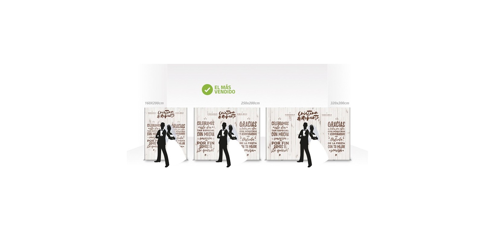 Nuestro photocall efecto madera rústica vintage están producidos en lona de alta calidad sujetados mediante una estructura de PVC y fibra de vidrio. Gracias a estos materiales es muy cómodo transportar el photocall de un sitio ya que no pesa y es un material muy ligero. Te proponemos 3 medidas a elegir según lo que quieras y opciones más económicas para que te adaptes al que mejor se ajuste a ti.