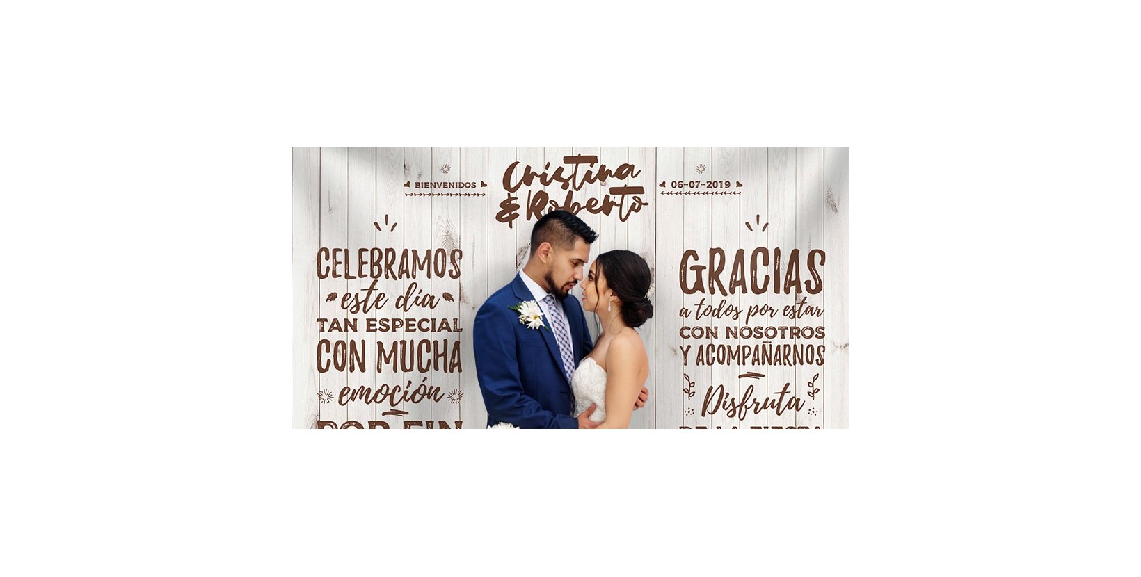 Configurar tu photocall para boda es muy fácil gracias a nuestro diseñador online. Lo único que tendrás que hacer es clickar en el botón "personalízalo online" y cambiar los nombres de los novios y la fecha del enlace con una tipografía de nuestro catálogo, y en cuestión de minutos podrás realizar el pedido.