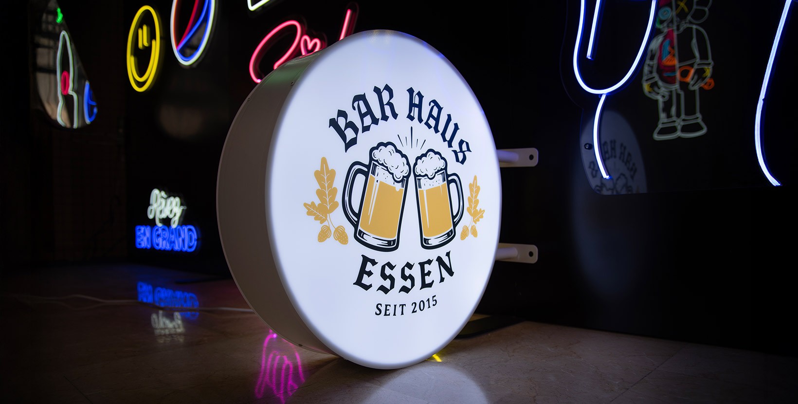 Wählen Sie die runde Leuchtreklame, wenn Sie sich von anderen Geschäften abheben möchten, und personalisieren Sie diese einfach und schnell mit unserem Online-Konfigurator.