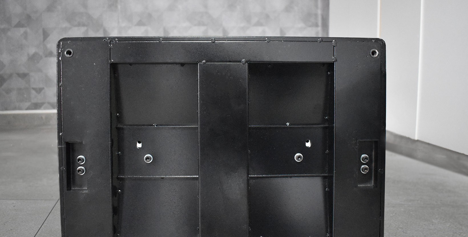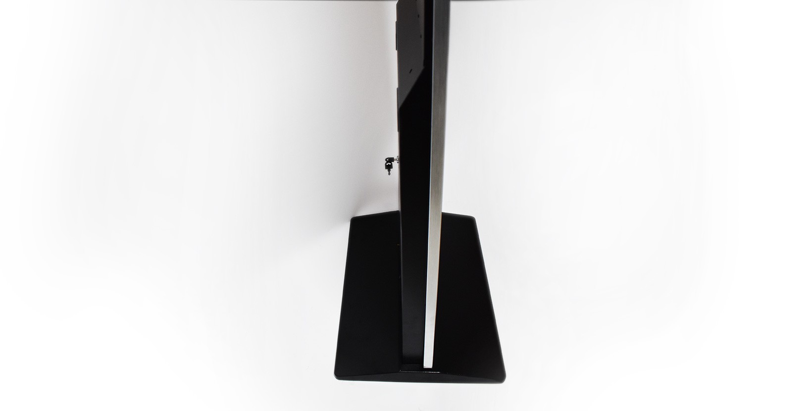 Schlankes Design (18 cm dick, 180 cm hoch) und hochwertige Materialien wie Stahl, Aluminium und gehärtetes Glas sorgen für Stabilität und Eleganz.