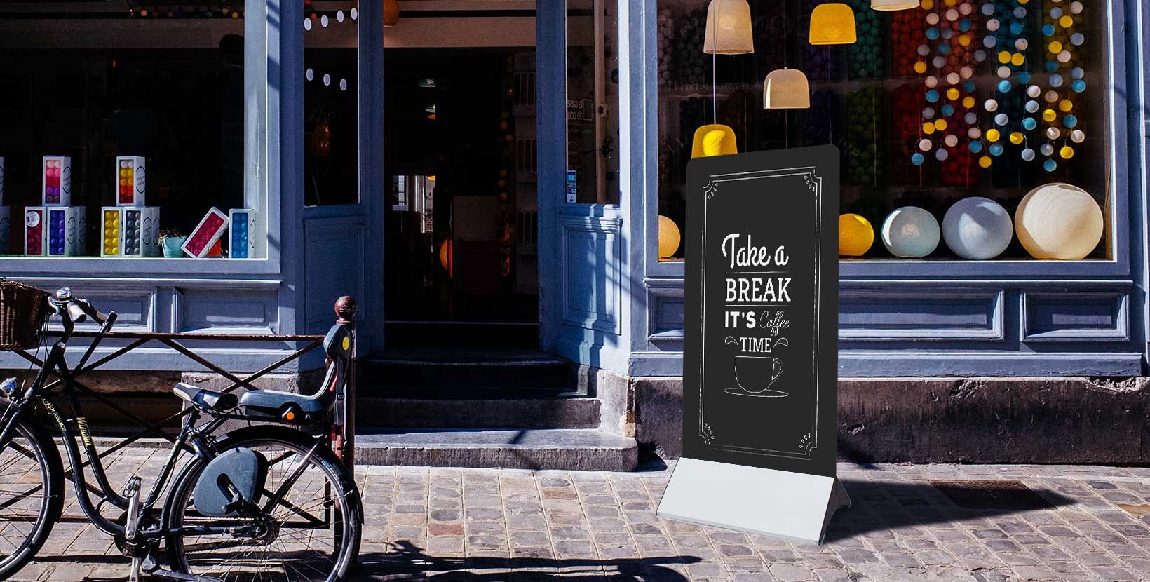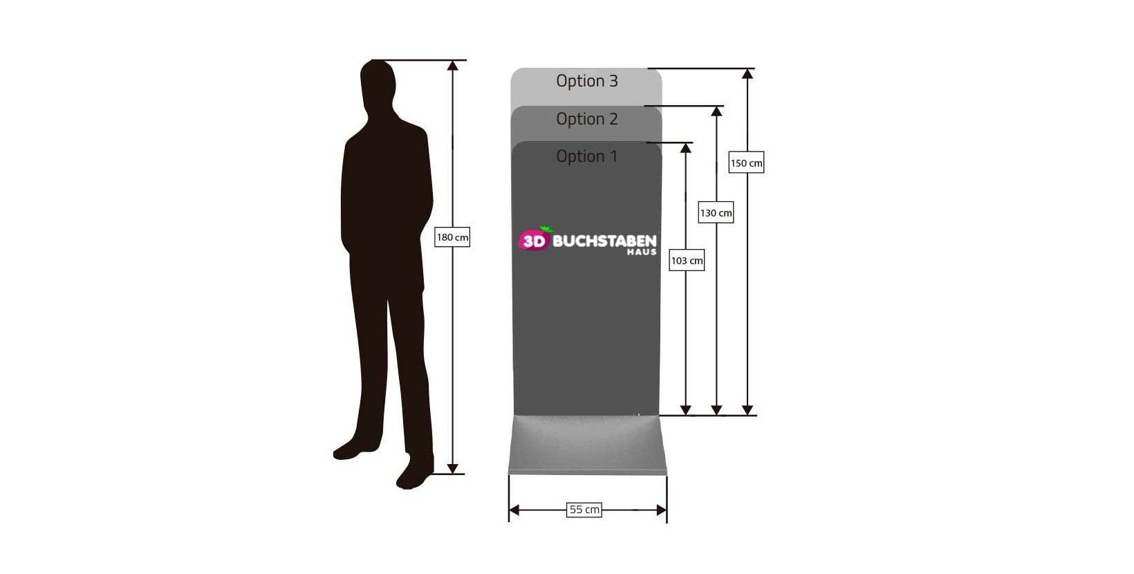 Der Plakatständer eignet sich sowohl für Innen- als auch Außeneinsätze. Die Aluminium-Basis ist 55 cm breit, das Panel mit abgerundeten Kanten ist in drei Größen erhältlich: 55x103 cm, 55x130 cm und 55x150 cm.