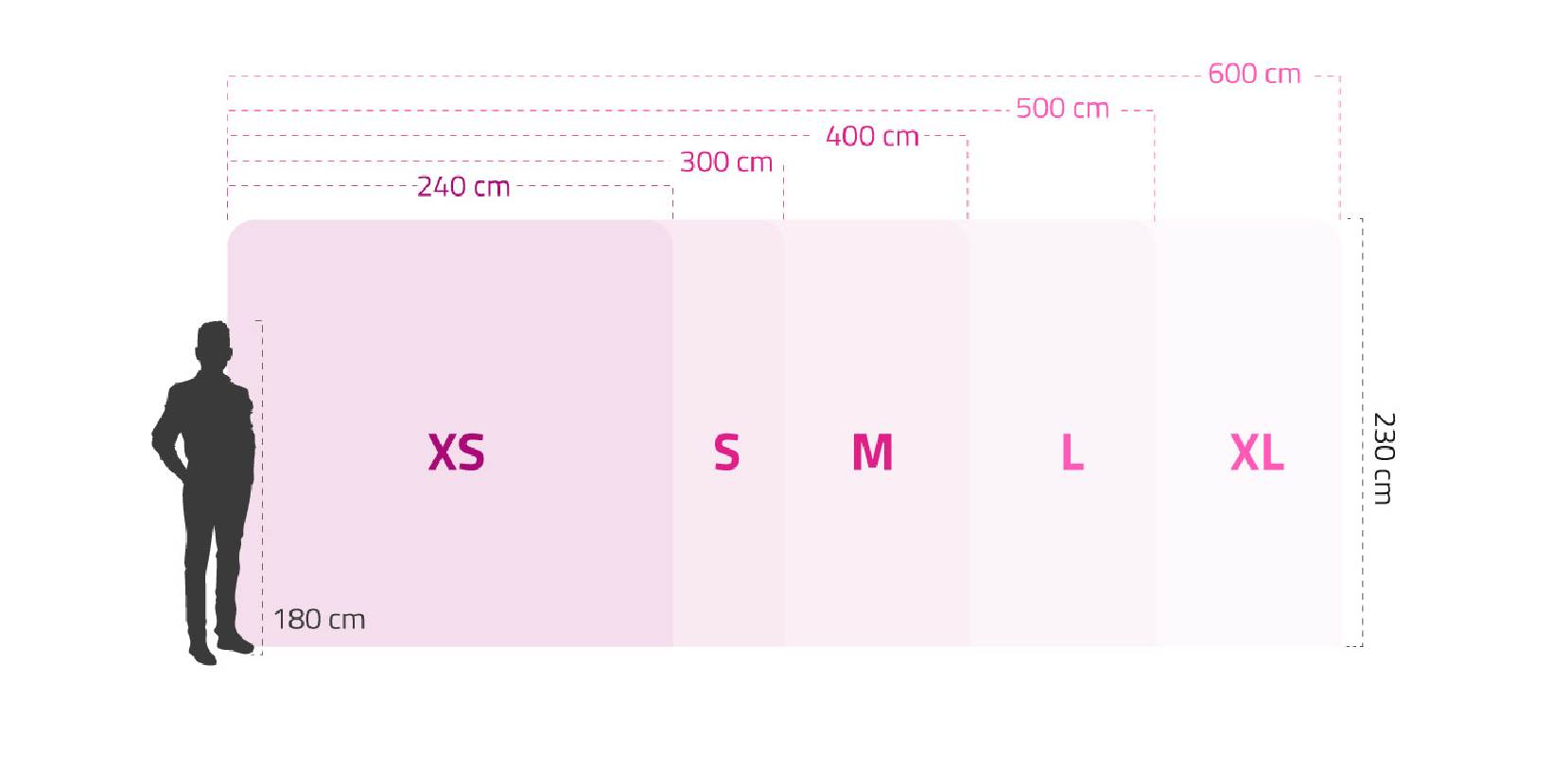 | Größen | XS 240x230 cm, S 300x230 cm, M 400x230 cm, L 500x230 cm, XL 600x230 cm |