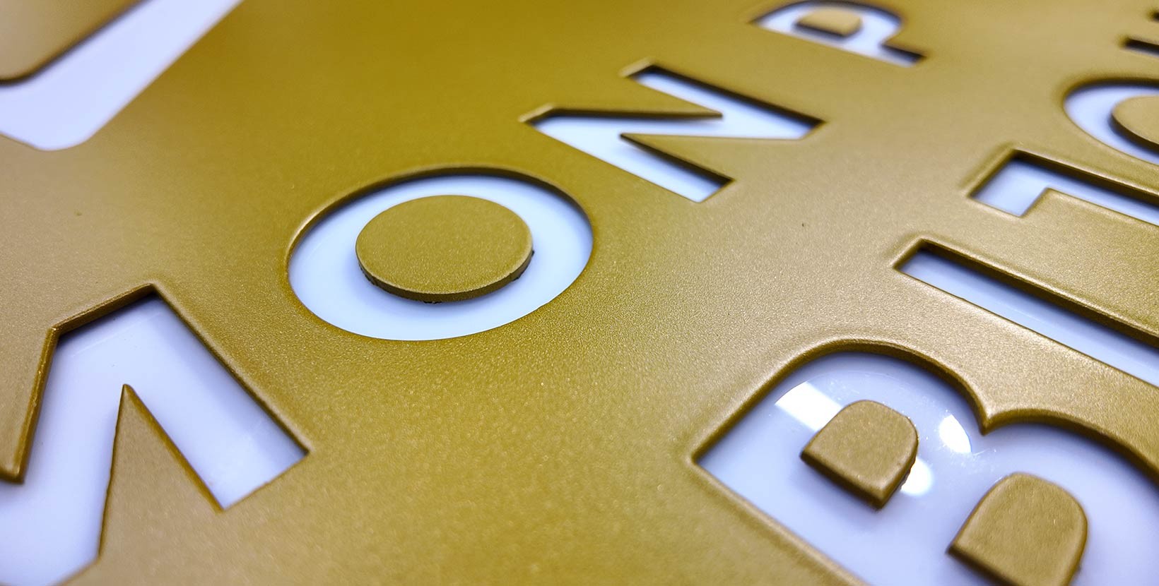 Je nach Design können Sie die Ausführung wählen: mit einfarbigen Oberflächen wie Weiß oder Schwarz. Bei filigranen Schriften oder komplexen Formen verwenden wir Stahl, um eine höhere Widerstandsfähigkeit gegenüber Stößen und Kratzern sowie eine präzisere Darstellung feiner Details zu gewährleisten.