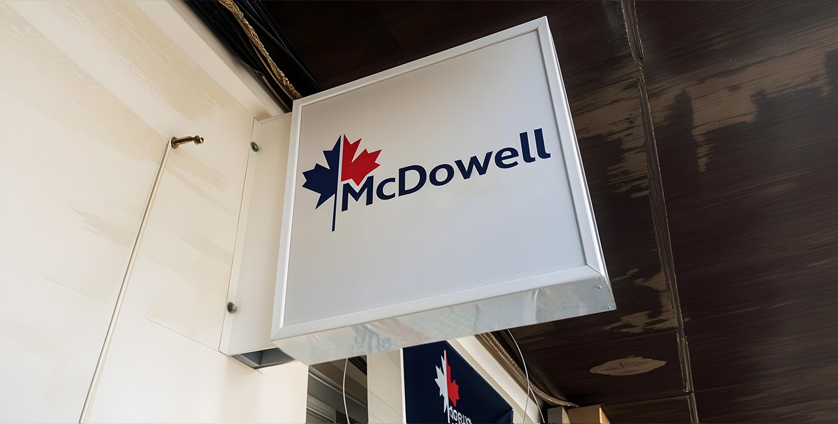 Bedrucktes Leinwandbanner, konfektioniert und an der Wand mit zwei...