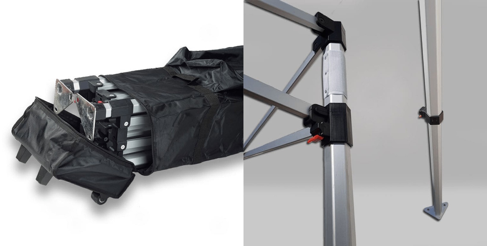 Zusammengeklappt benötigt der Pavillon nur wenig Platz und ist dadurch leicht zu lagern und zu transportieren. Im Preis enthalten sind Gestell, Dach und Volant inklusive vollständiger Personalisierung. Zusätzlich können Seitenwände, Seiten mit Fenster oder sogar Türen hinzugewählt werden – alle ebenfalls ohne Aufpreis bedruckbar.