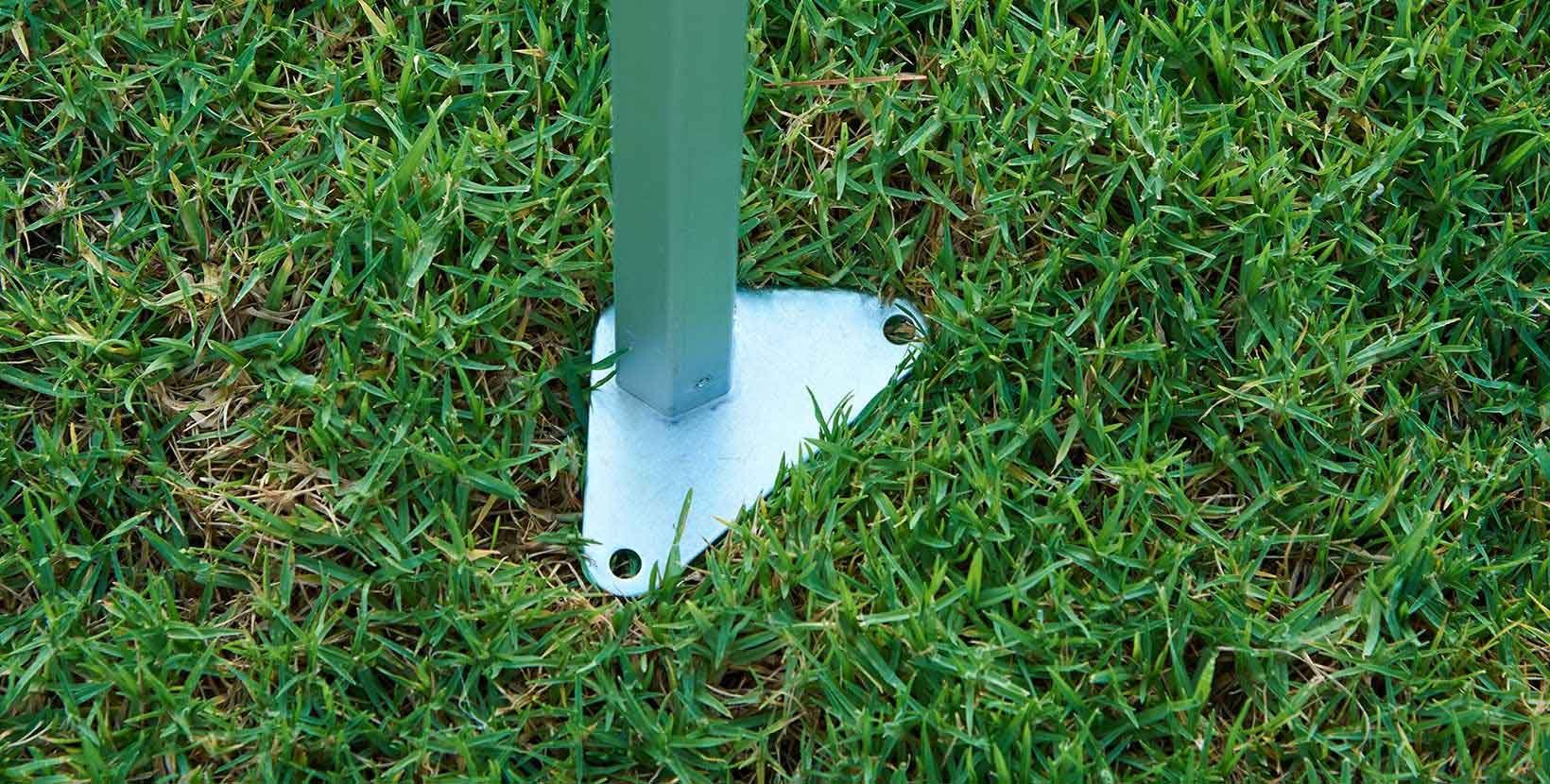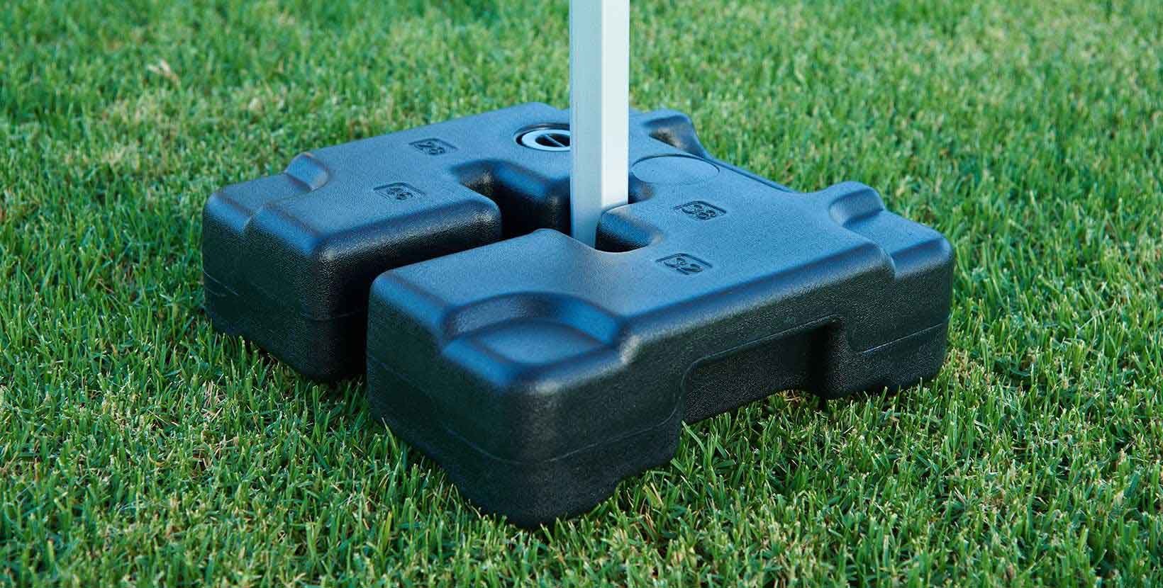 Zur Auswahl stehen Bodenplatten mit Bohrungen zur Verankerung oder befüllbare Gewichtsbasen mit Wasser oder Sand für den Außenbereich.