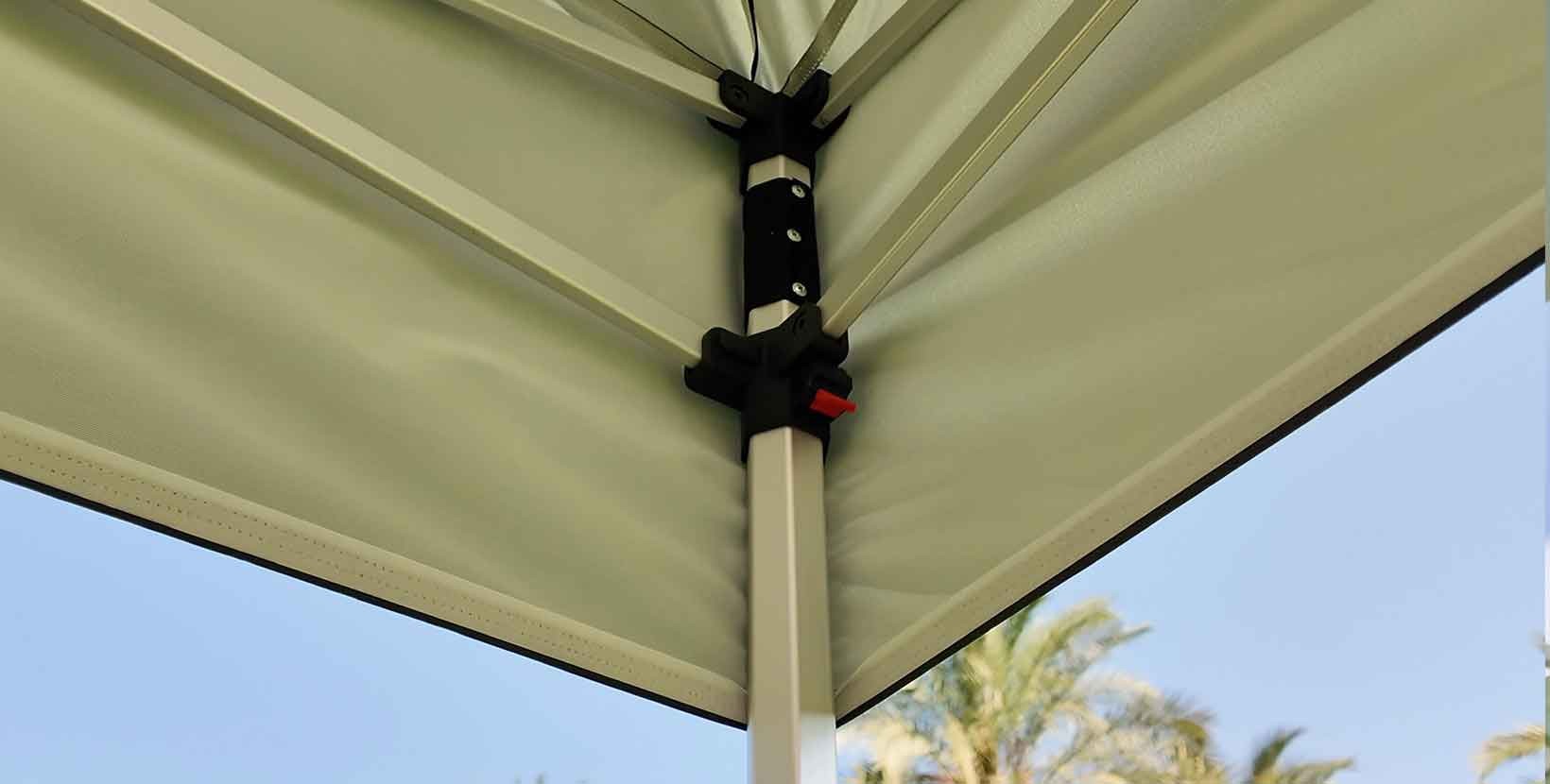 Gestell auseinanderziehen, Dach korrekt positionieren und Beine auf gewünschte Höhe einstellen. Für zusätzliche Stabilität die Bodenverankerung nutzen.