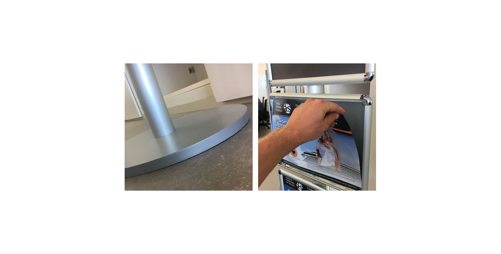 Sie können Ihre Drucke einfach auf Ihrem Drucker erstellen und in den Rahmen in Sekundenschnelle einsetzen. Das Produkt, Austauschbares Grafik Display, ist in verschiedenen Rahmenkombinationen und Größen erhältlich. Mast und Rahmen aus eloxiertem Aluminium in Naturfarbe, die Basis aus matt-silber lackiertem Holz.