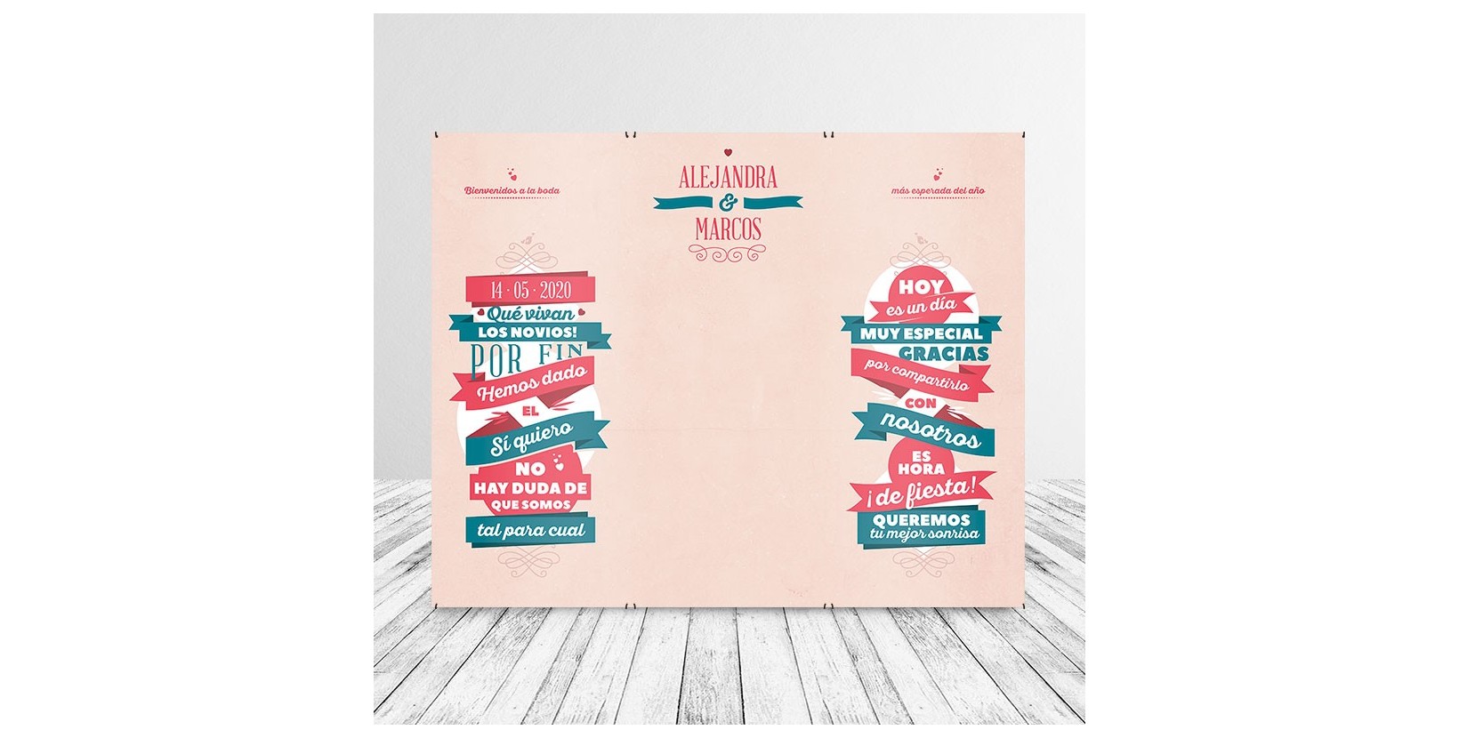 Elige el nombre de los novios, la fecha y más detalles y personaliza tu propio photocall de boda vintage. Una idea original que no puede faltar en tu boda. Disponible en 3 tamaños.