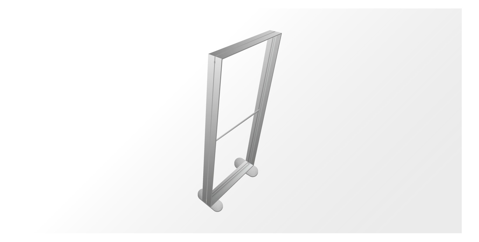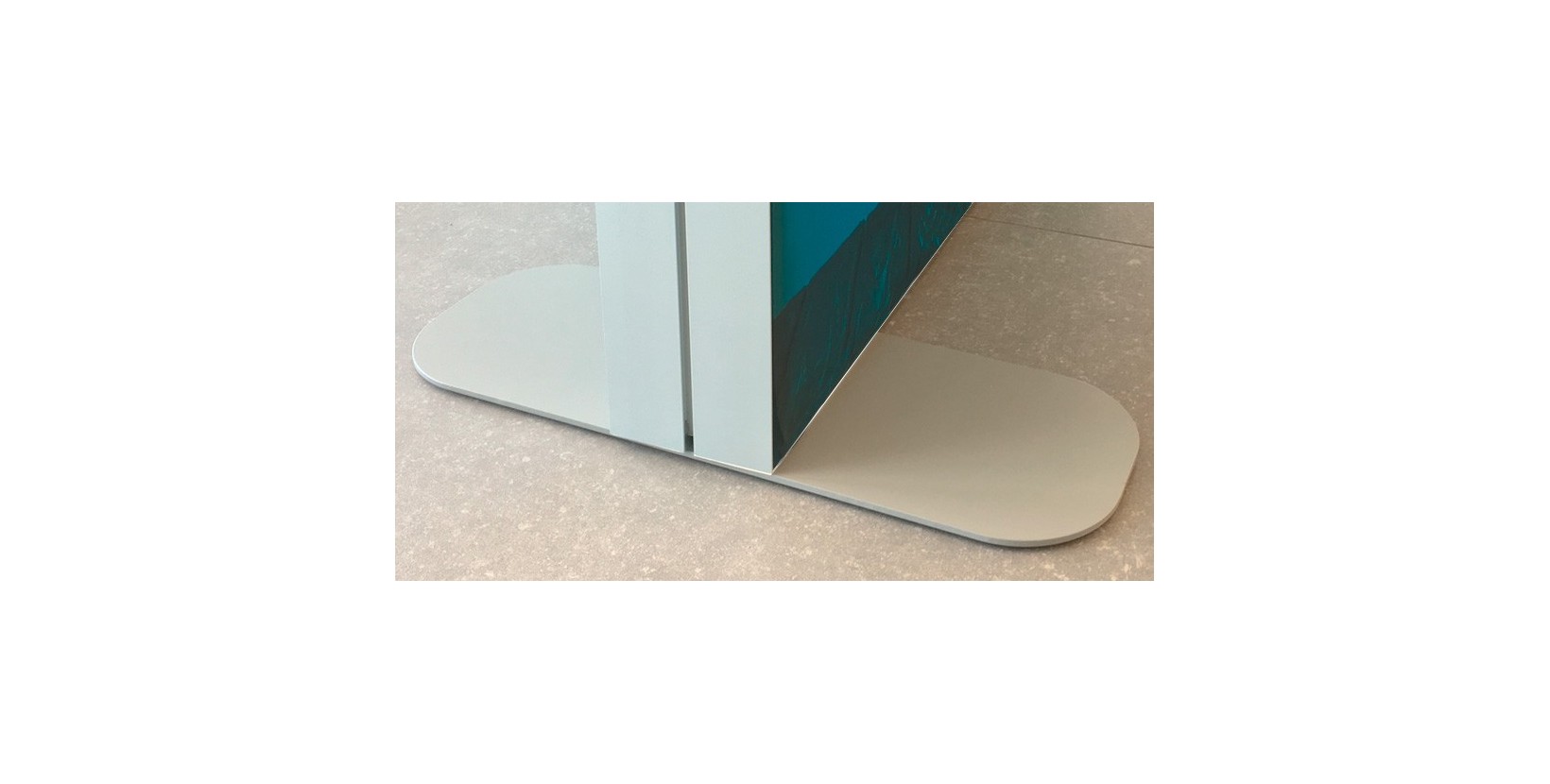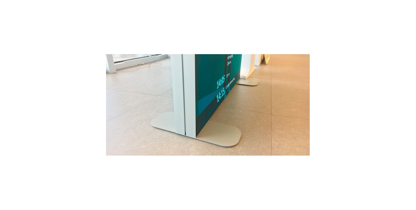 Die Basis des Textiltotems besteht aus Aluminiumfüßen mit den Maßen 30 x 12,5 cm, die für strukturelle Stabilität und gleichmäßige Gewichtsverteilung sorgen.