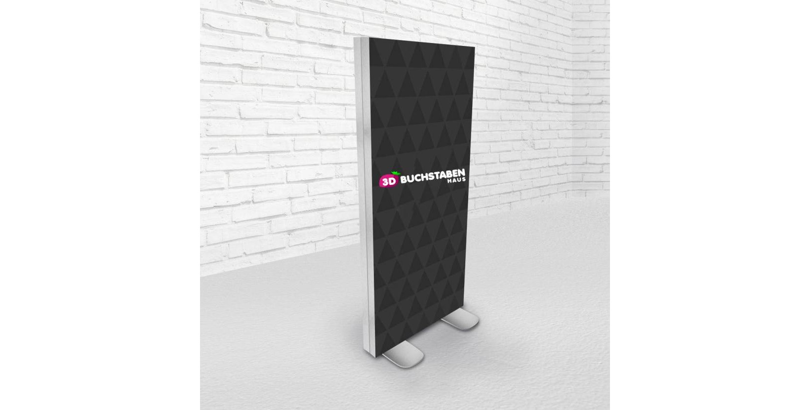 Doppelseitiges Werbetotem mit LED-Beleuchtung, bestehend aus Aluminiumgestell und Frontflächen aus individuell bedrucktem Textil. Dieses Textildisplay erlaubt den einfachen Austausch der Grafiken durch nicht spezialisiertes Personal, was Zeit und Transportkosten spart.